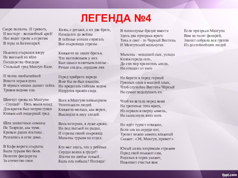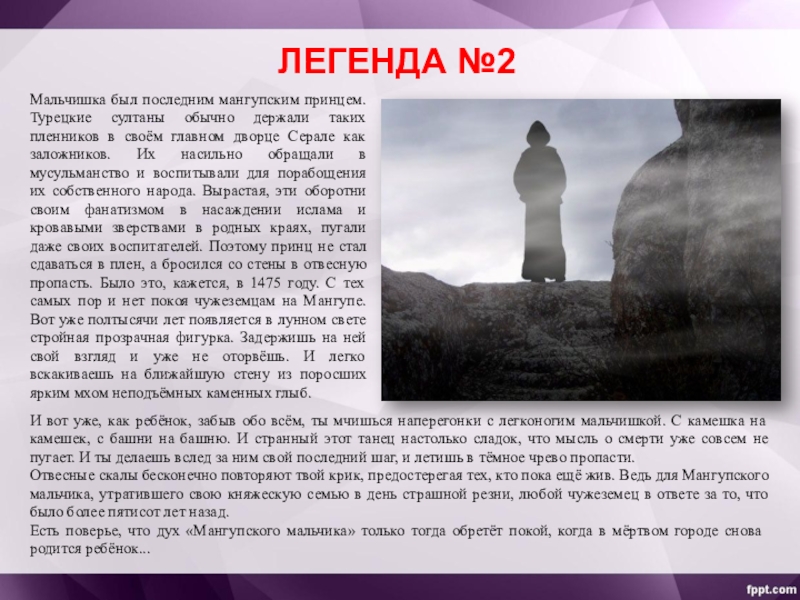 пленников в своём главном дворце Серале как заложников. Их насильно обращали в мусульманство и воспитывали для порабощения их собственного народа. Вырастая, эти оборотни своим фанатизмом в насаждении ислама и кровавыми зверствами в родных краях, пугали даже своих воспитателей. Поэтому принц не стал сдаваться в плен, а бросился со стены в отвесную пропасть. Было это, кажется, в 1475 году. С тех самых пор и нет покоя чужеземцам на Мангупе. Вот уже полтысячи лет появляется в лунном свете стройная прозрачная фигурка. Задержишь на ней свой взгляд и уже не оторвёшь. И легко вскакиваешь на ближайшую стену из поросших ярким мхом неподъёмных каменных глыб.