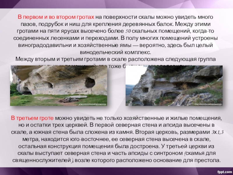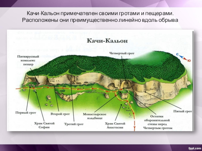 Слайд 33Качи-Кальон примечателен своими гротами и пещерами. Расположены они преимущественно линейно вдоль
