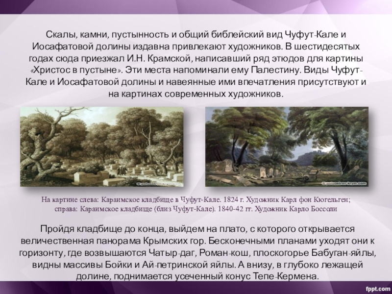 издавна привлекают художников. В шестидесятых годах сюда приезжал И.Н. Крамской, написавший ряд этюдов для картины «Христос в пустыне». Эти места напоминали ему Палестину. Виды Чуфут-Кале и Иосафатовой долины и навеянные ими впечатления присутствуют и на картинах современных художников.