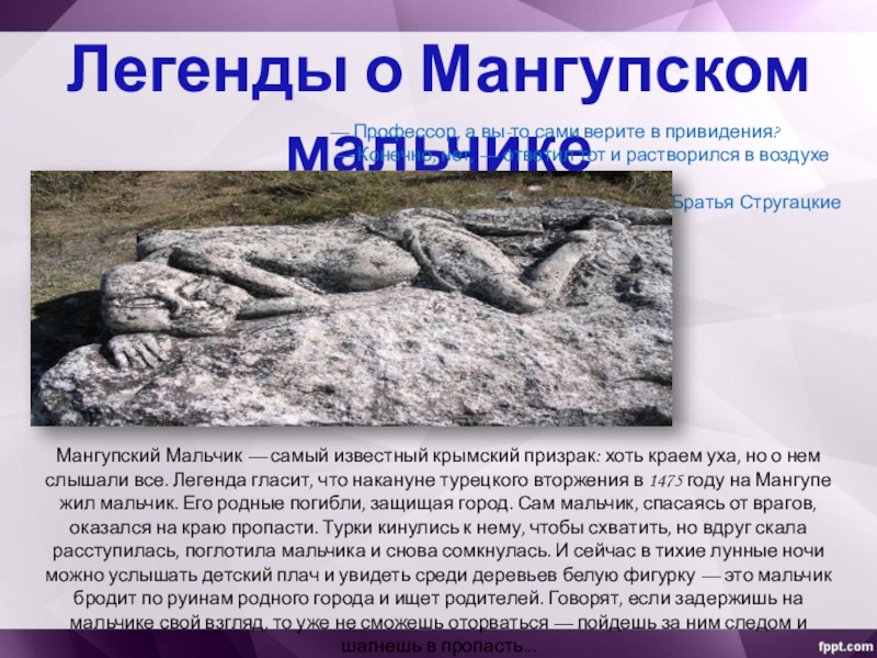 Мангупский Мальчик — самый известный крымский призрак: хоть краем уха, но о нем слышали все. Легенда гласит, что накануне турецкого вторжения в 1475 году на Мангупе жил мальчик. Его родные погибли, защищая город. Сам мальчик, спасаясь от врагов, оказался на краю пропасти. Турки кинулись к нему, чтобы схватить, но вдруг скала расступилась, поглотила мальчика и снова сомкнулась. И сейчас в тихие лунные ночи можно услышать детский плач и увидеть среди деревьев белую фигурку — это мальчик бродит по руинам родного города и ищет родителей. Говорят, если задержишь на мальчике свой взгляд, то уже не сможешь оторваться — пойдешь за ним следом и шагнешь в пропасть...