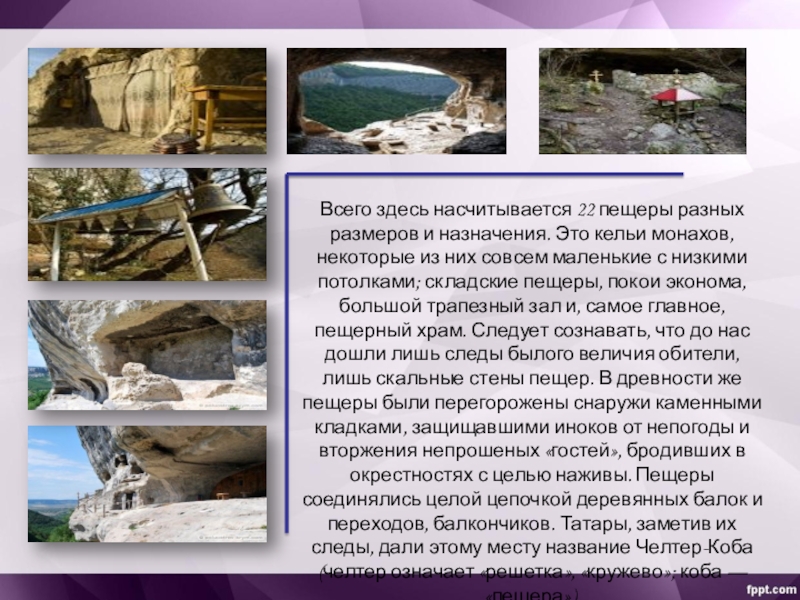 монахов, некоторые из них совсем маленькие с низкими потолками; складские пещеры, покои эконома, большой трапезный зал и, самое главное, пещерный храм. Следует сознавать, что до нас дошли лишь следы былого величия обители, лишь скальные стены пещер. В древности же пещеры были перегорожены снаружи каменными кладками, защищавшими иноков от непогоды и вторжения непрошеных «гостей», бродивших в окрестностях с целью наживы. Пещеры соединялись целой цепочкой деревянных балок и переходов, балкончиков. Татары, заметив их следы, дали этому месту название Челтер-Коба (челтер означает «решетка», «кружево»; коба — «пещера»).