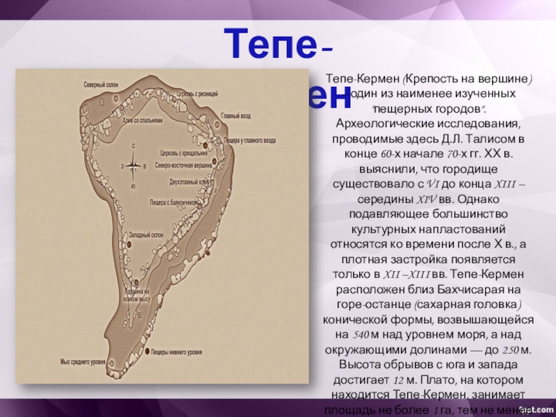 Слайд 30По своей площади Тепе-Кермен является самым маленьким "пещерным городом", его территория