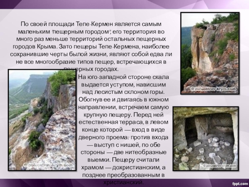 во много раз меньше территорий остальных пещерных городов Крыма. Зато пещеры Тепе-Кермена, наиболее сохранившие черты былой жизни, являют собой едва ли не все многообразие типов пещер, встречающихся в пещерных городах.