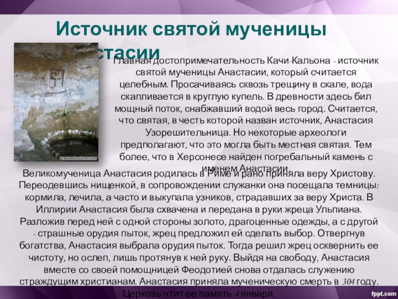 который считается целебным. Просачиваясь сквозь трещину в скале, вода скапливается в круглую купель. В древности здесь бил мощный поток, снабжавший водой весь город. Считается, что святая, в честь которой назван источник, Анастасия Узорешительница. Но некоторые археологи предполагают, что это могла быть местная святая. Тем более, что в Херсонесе найден погребальный камень с именем Анастасии.