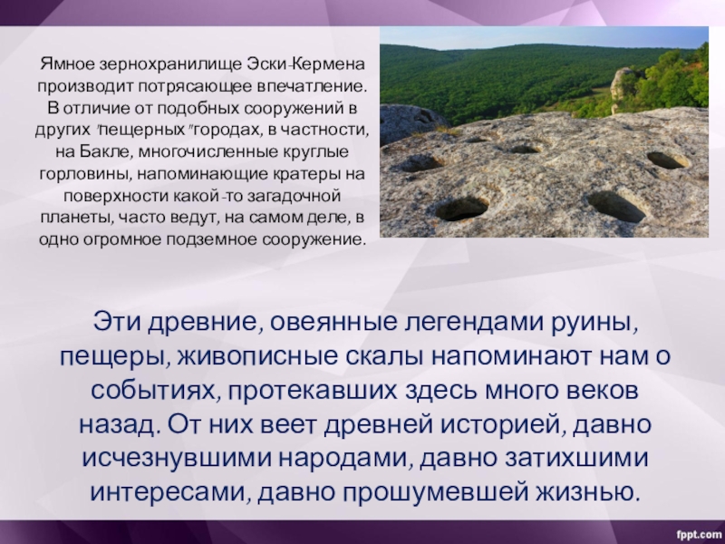 Слайд 7Ямное зернохранилище Эски-Кермена производит потрясающее впечатление. В отличие от подобных сооружений