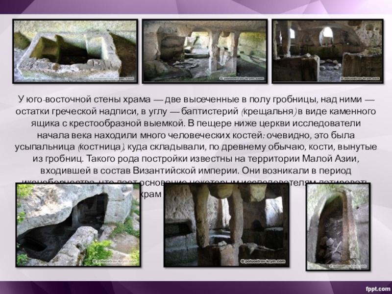 ними — остатки греческой надписи, в углу — баптистерий (крещальня) в виде каменного ящика с крестообразной выемкой. В пещере ниже церкви исследователи начала века находили много человеческих костей: очевидно, это была усыпальница (костница), куда складывали, по древнему обычаю, кости, вынутые из гробниц. Такого рода постройки известны на территории Малой Азии, входившей в состав Византийской империи. Они возникали в период иконоборчества, что дает основание некоторым исследователям датировать этот храм Тепе-Кермена VIII-IX вв.