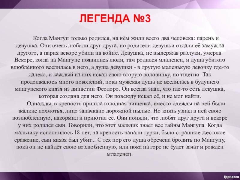 парень и девушка. Они очень любили друг друга, но родители девушки отдали её замуж за другого, а парня вскоре убили на войне. Девушка, не выдержав разлуки, умерла. Вскоре, когда на Мангупе появились люди, там родился младенец, и душа убитого влюблённого вселилась в него, а душа девушки - в другую маленькую девочку где-то далеко, и каждый из них искал свою вторую половинку, но тщетно. Так продолжалось много поколений, пока мужская душа не вселилась в будущего мангупского князя из династии Феодоро. Он всегда знал, что где-то есть девушка, которая создана для него. Он повсюду искал её, и не мог найти.