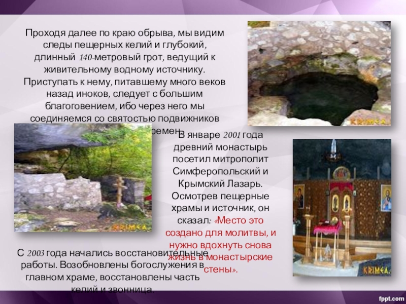 В январе 2001 года древний монастырь посетил митрополит Симферопольский и Крымский Лазарь. Осмотрев пещерные храмы и источник, он сказал: «Место это создано для молитвы, и нужно вдохнуть снова жизнь в монастырские стены».