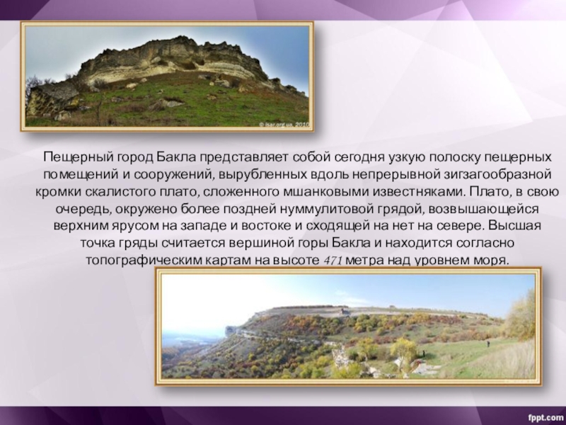Слайд 39Пещерный город Бакла представляет собой сегодня узкую полоску пещерных помещений и