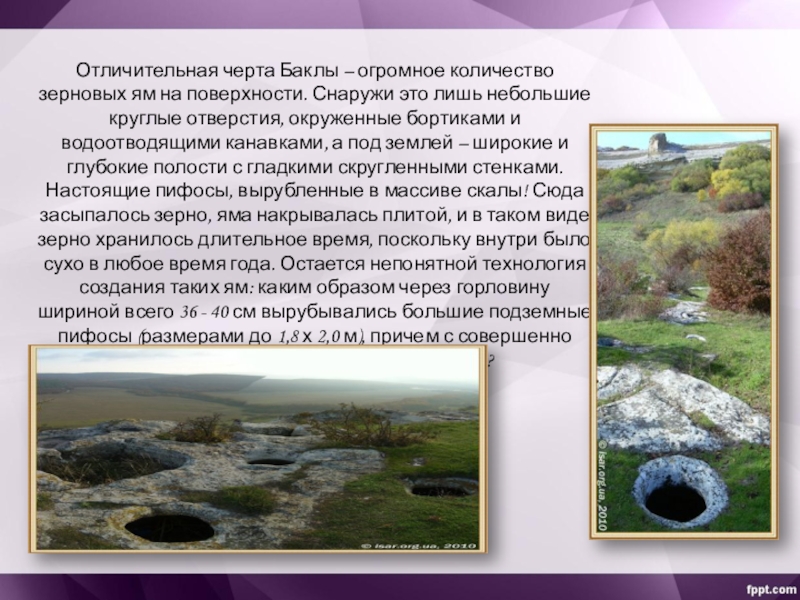 Слайд 40Отличительная черта Баклы – огромное количество зерновых ям на поверхности. Снаружи