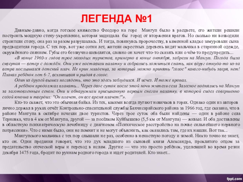 «В конце 1960-х годов трое молодых туристов, примерно в конце октября, забрели на Мангуп. Погода была скверная — ветер с дождём. Они уже поставили палатку и собрались ложиться спать, как вдруг откуда-то из-за ветра послышался детский плач. Не крик младенца, за который можно принять "голос" какого-нибудь зверя, нет! Плакал ребёнок лет 6-7, всхлипывая и рыдая в голос.