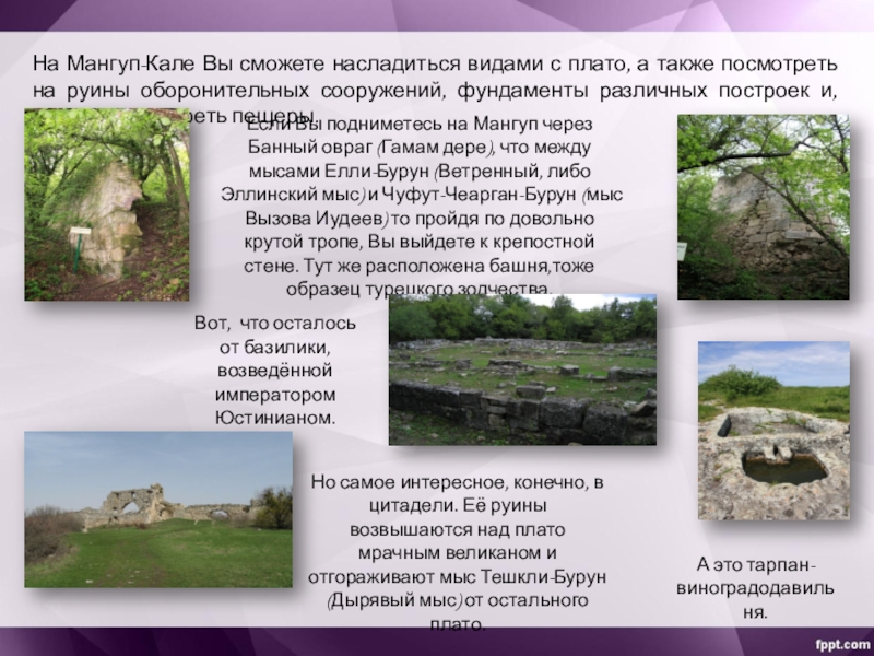 Слайд 13На Мангуп-Кале Вы сможете насладиться видами с плато, а также посмотреть