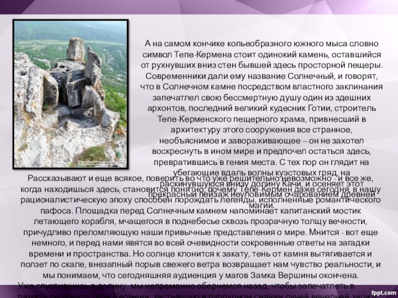 одинокий камень, оставшийся от рухнувших вниз стен бывшей здесь просторной пещеры. Современники дали ему название Солнечный, и говорят, что в Солнечном камне посредством властного заклинания запечатлел свою бессмертную душу один из здешних архонтов, последний великий кудесник Готии, строитель Тепе-Керменского пещерного храма, привнесший в архитектуру этого сооружения все странное, необъяснимое и завораживающее – он не захотел воскреснуть в ином мире и предпочел остаться здесь, превратившись в гения места. С тех пор он глядит на убегающие вдаль волны куэстовых гряд, на раскинувшуюся внизу долину Качи, и осеняет этот прекрасный пейзаж неуловимым очарованием древней магии.