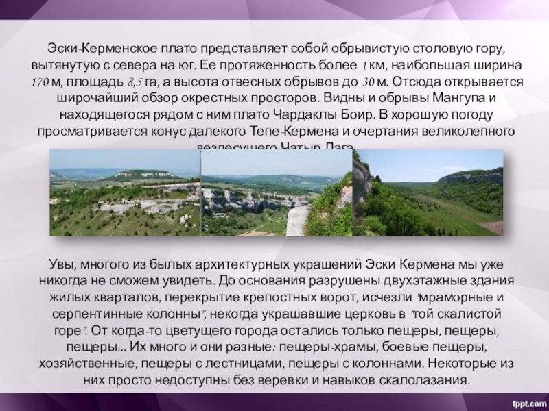 Слайд 4Эски-Керменское плато представляет собой обрывистую столовую гору, вытянутую с севера на