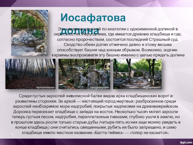 окрестностях Иерусалима, где имеется древнее кладбище и где, согласно пророчествам, состоится последний Страшный суд. Сходство обеих долин отмечено давно и этому весьма способствует башня над южным обрывом. Возможно, зодчие-караимы воспроизвели эту башню именно с целью придать долине истинно библейский облик.