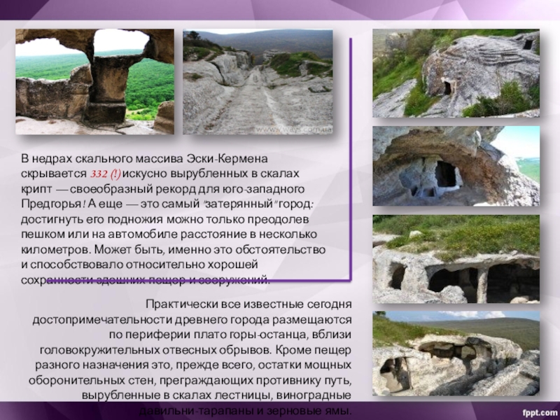 Слайд 6В недрах скального массива Эски-Кермена скрывается 332 (!) искусно вырубленных в