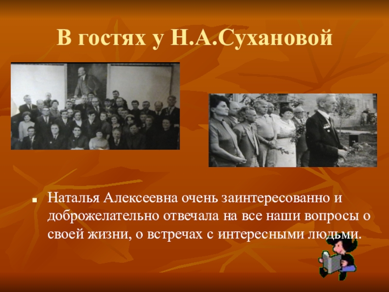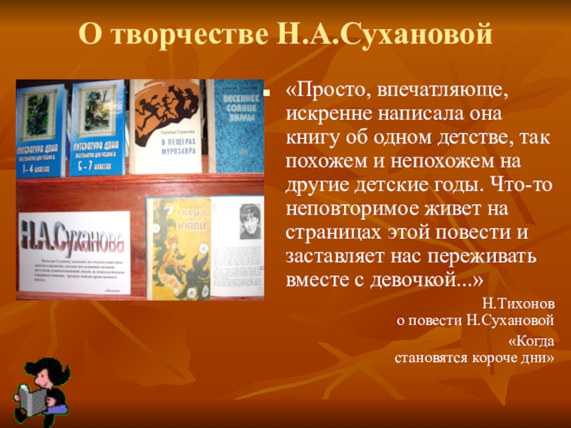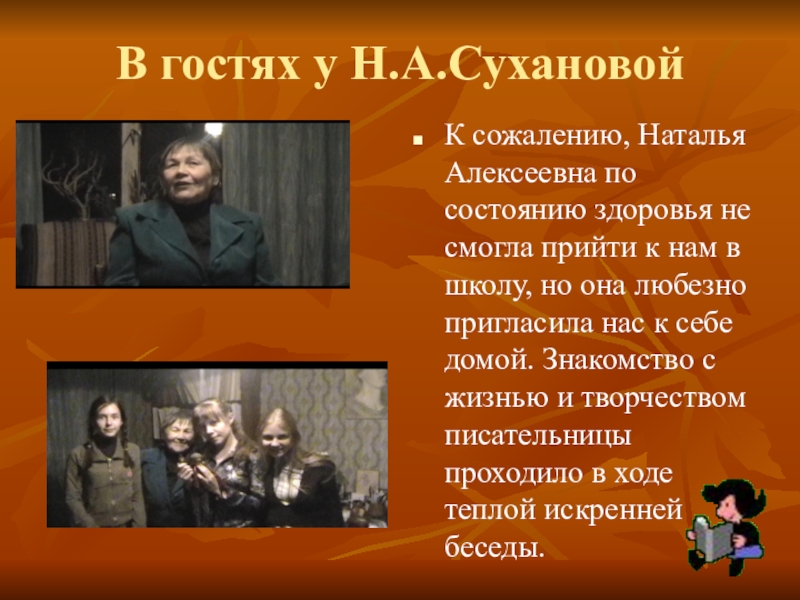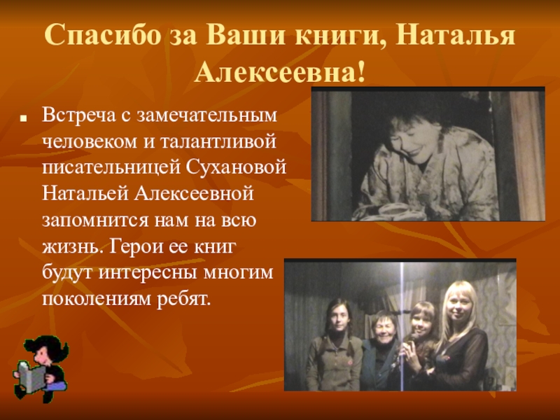 писательницей Сухановой Натальей Алексеевной запомнится нам на всю жизнь. Герои ее книг будут интересны многим поколениям ребят.