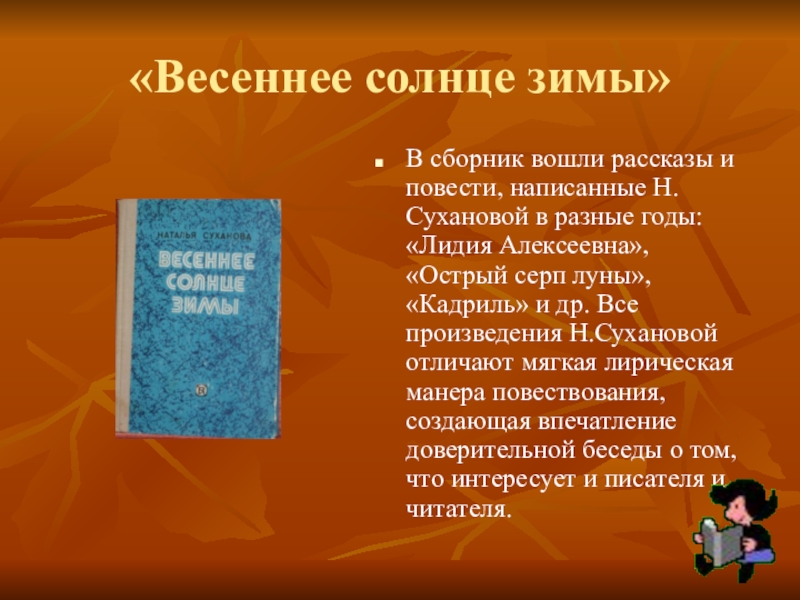 в разные годы: «Лидия Алексеевна», «Острый серп луны», «Кадриль» и др. Все произведения Н.Сухановой отличают мягкая лирическая манера повествования, создающая впечатление доверительной беседы о том, что интересует и писателя и читателя.