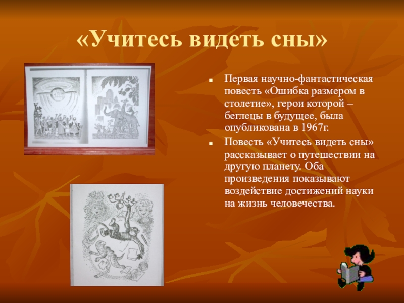 Повесть «Учитесь видеть сны» рассказывает о путешествии на другую планету. Оба произведения показывают воздействие достижений науки на жизнь человечества.