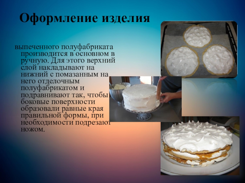 Готовое тесто сразу выпекают в виде лепешек на кондитерских листах для тортов круглой или прямоугольной формы, используя для этой цели железные рамы или кольца определенного размера. Кондитерские листы смазывают маслом, подпыливают мукой, ставят на них раму или кольцо, наполняют слоем теста толщиной 8-10 мм, выравнивают ножом и выпекают при температуре 100-110 С около 1 часа.