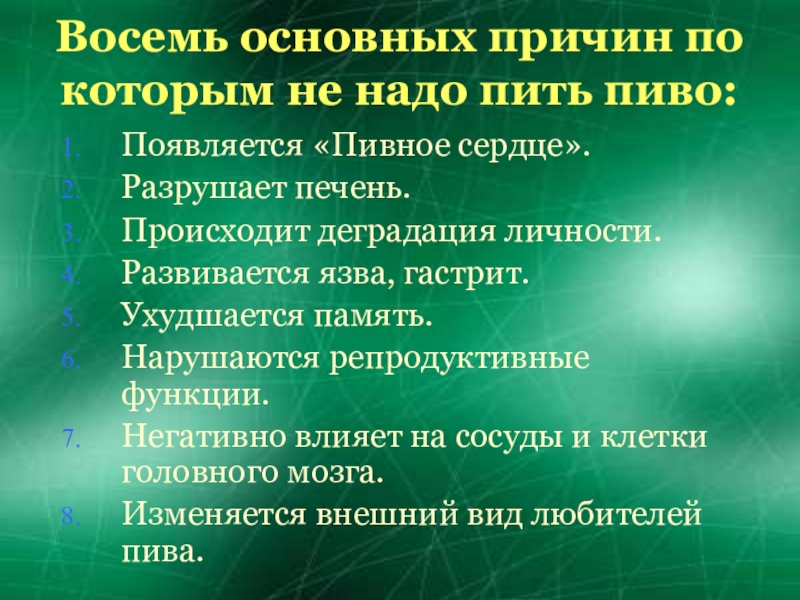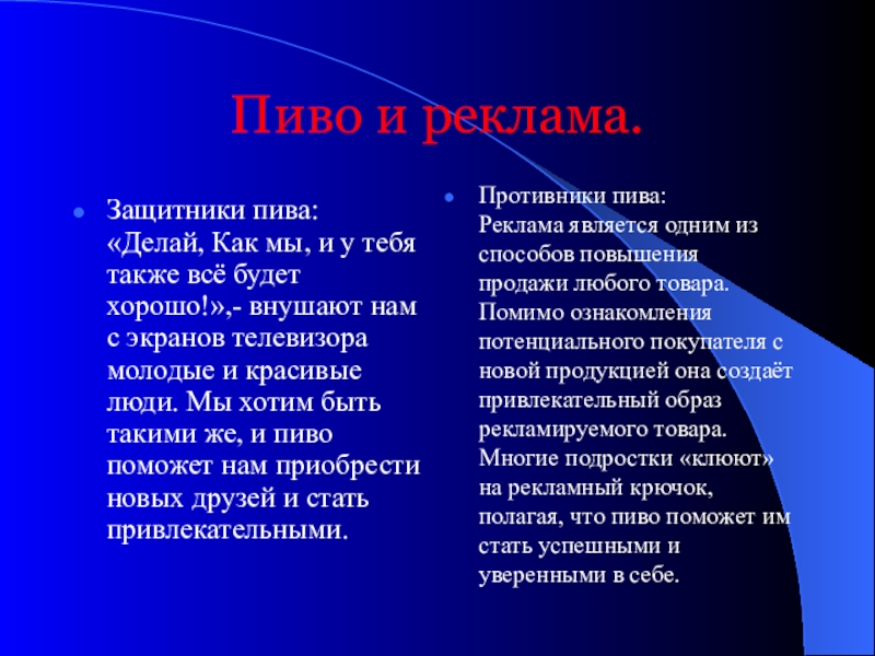 Противники пива: Реклама является одним из способов повышения продажи любого товара. Помимо ознакомления потенциального покупателя с новой продукцией она создаёт привлекательный образ рекламируемого товара. Многие подростки «клюют» на рекламный крючок, полагая, что пиво поможет им стать успешными и уверенными в себе.