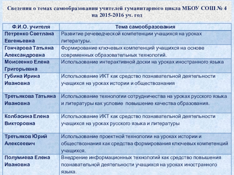 Слайд 3Сведения о темах самообразования учителей гуманитарного цикла МБОУ СОШ № 4