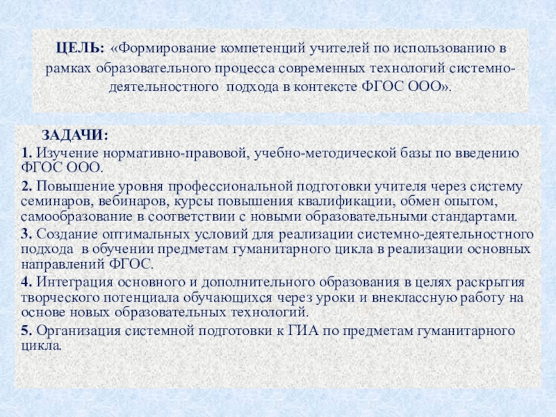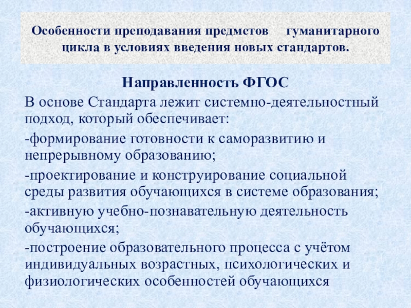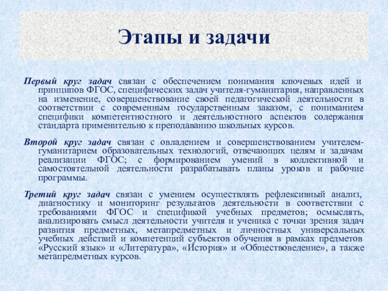 и принципов ФГОС, специфических задач учителя-гуманитария, направленных на изменение, совершенствование своей педагогической деятельности в соответствии с современным государственным заказом, с пониманием специфики компетентностного и деятельностного аспектов содержания стандарта применительно к преподаванию школьных курсов.
