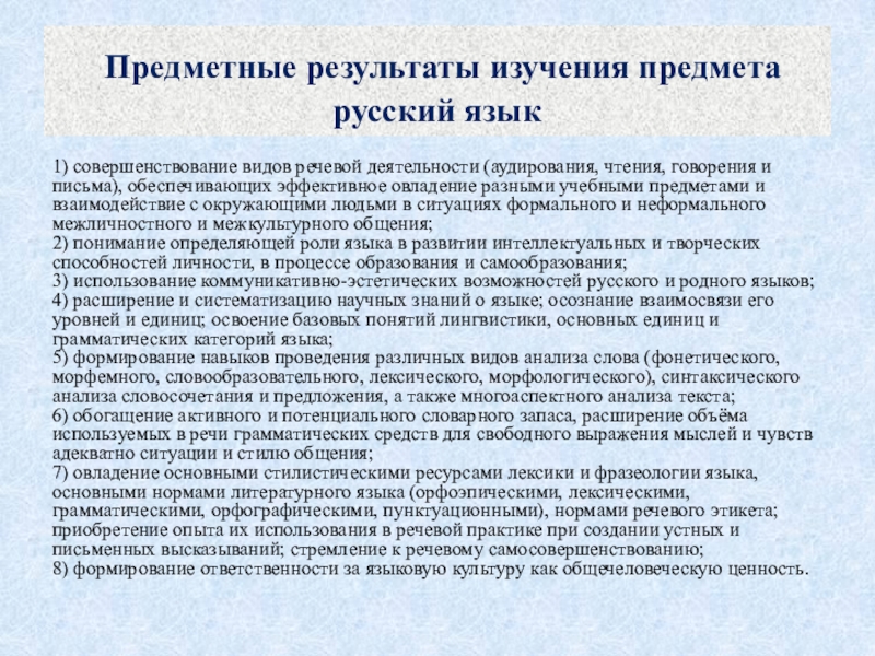 Слайд 11 Предметные результаты изучения предмета русский язык