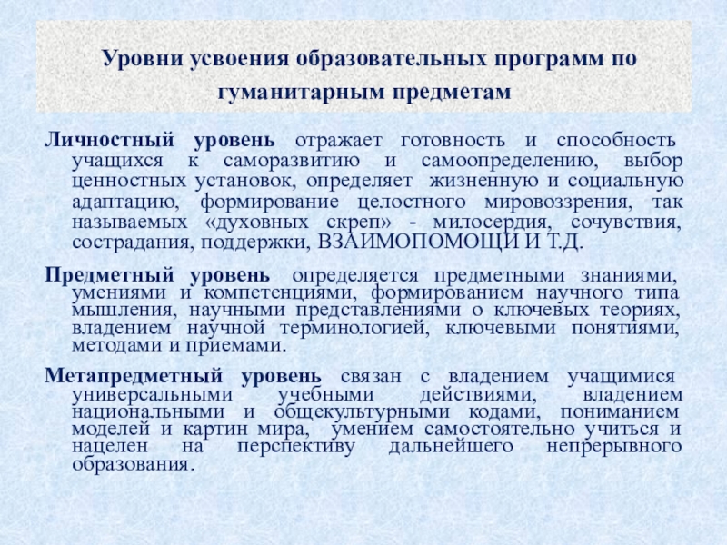 Слайд 10 Уровни усвоения образовательных программ по гуманитарным предметам