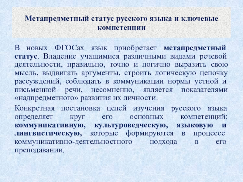 Слайд 12Метапредметный статус русского языка и ключевые компетенции