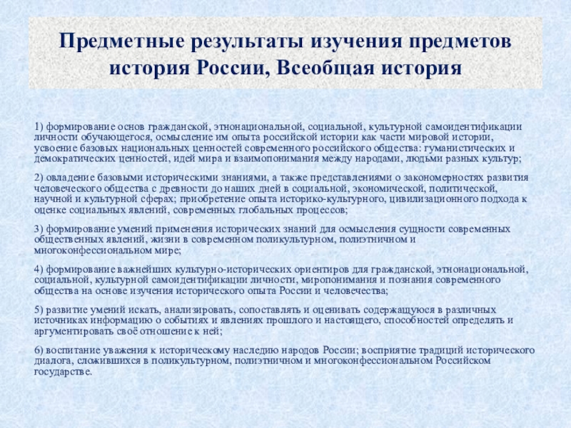 6) воспитание уважения к историческому наследию народов России; восприятие традиций исторического диалога, сложившихся в поликультурном, полиэтничном и многоконфессиональном Российском государстве.