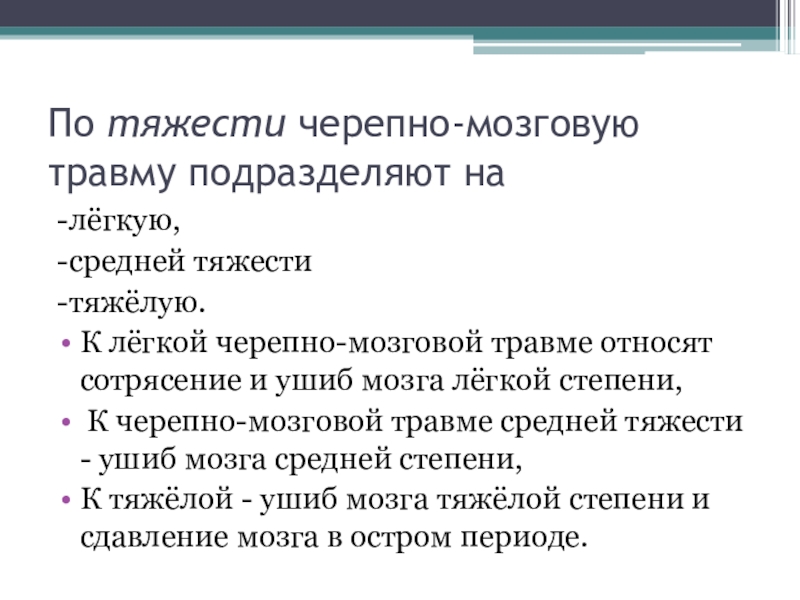 Слайд 11По тяжести черепно-мозговую травму подразделяют на