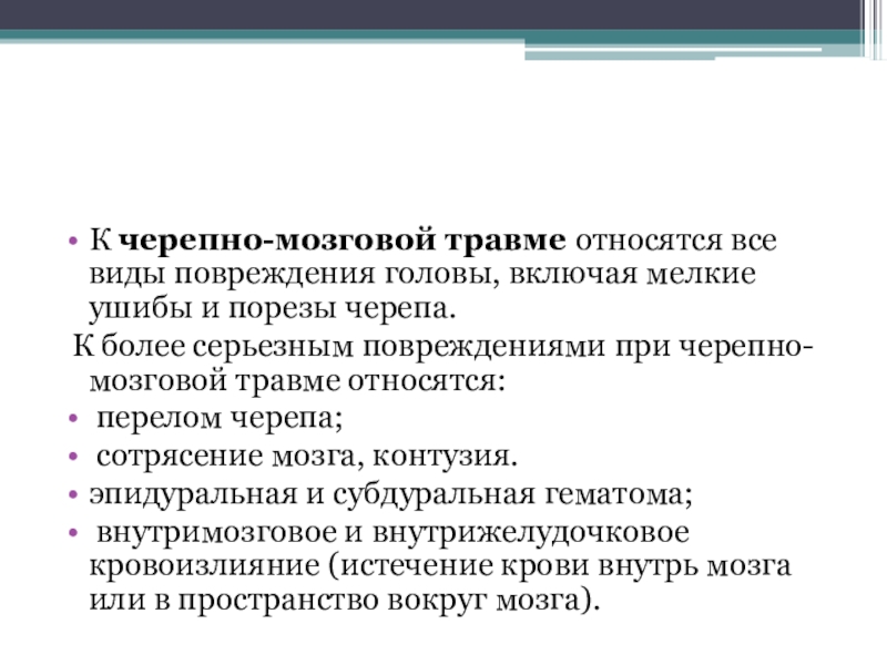 К черепно-мозговой травме относятся все виды повреждения головы, включая мелкие ушибы