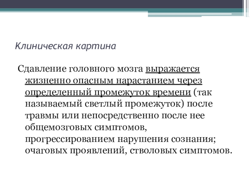 времени (так называемый светлый промежуток) после травмы или непосредственно после нее общемозговых симптомов, пpогpессиpованием нарушения сознания; очаговых проявлений, стволовых симптомов.
