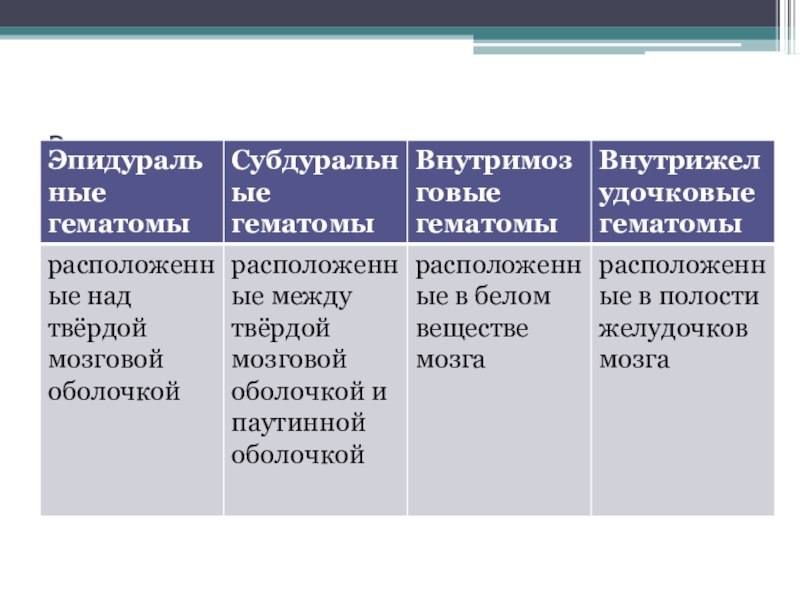 внутpичеpепные гематомы - эпидуpальные, субдуpальные, внутpимозговые и внутpижелудочковые;