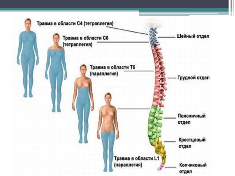 Тяжесть травмы спинного мозга зависит от уровня поражения спинного мозга. Чем выше уровень поражения спинного мозга, тем больше его проявления на двигательную сферу .