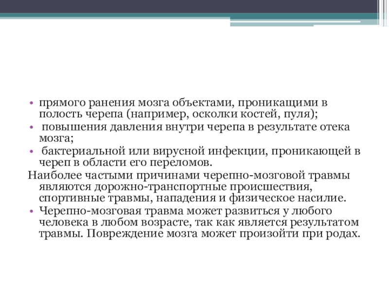 Наиболее частыми причинами черепно-мозговой травмы являются дорожно-транспортные происшествия, спортивные травмы, нападения и физическое насилие.
