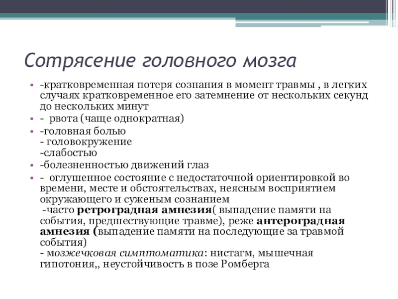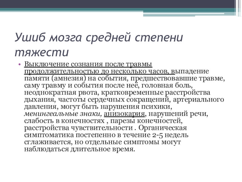 часов, выпадение памяти (амнезия) на события, предшествовавшие травме, саму травму и события после неё, головная боль, неоднократная рвота, кратковременные расстройства дыхания, частоты сердечных сокращений, артериального давления, могут быть нарушения психики, менингеальные знаки, анизокария, нарушений речи, слабость в конечностях , парезы конечностей, расстройства чувствительности . Органическая симптоматика постепенно в течение 2-5 недель сглаживается, но отдельные симптомы могут наблюдаться длительное время.