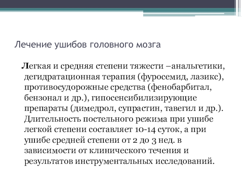 терапия (фуросемид, лазикс), противосудорожные средства (фенобарбитал, бензонал и др.), гипосенсибилизирующие препараты (димедрол, супрастин, тавегил и др.). Длительность постельного режима при ушибе легкой степени составляет 10-14 суток, а при ушибе средней степени от 2 до 3 нед. в зависимости от клинического течения и результатов инструментальных исследований.