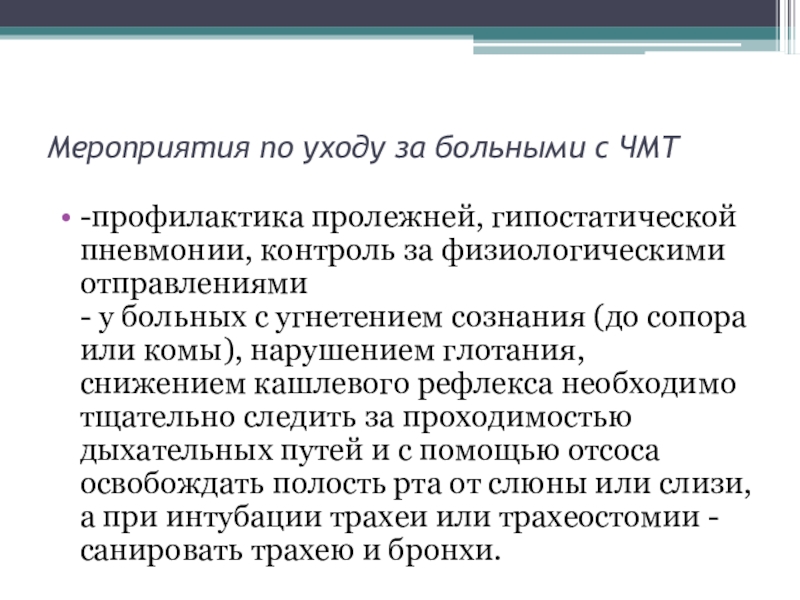 Слайд 38Мероприятия по уходу за больными с ЧМТ