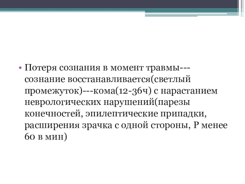 Потеря сознания в момент травмы--- сознание восстанавливается(светлый промежуток)---кома(12-36ч) с нарастанием неврологических