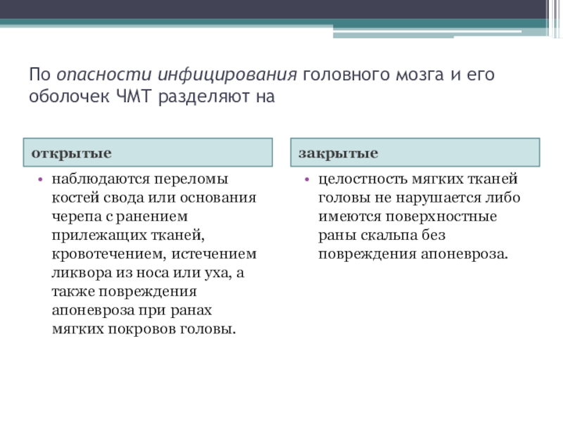 Слайд 8По опасности инфицирования головного мозга и его оболочек ЧМТ разделяют на