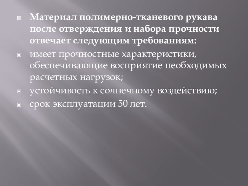 Слайд 21Материал полимерно-тканевого рукава после отверждения и набора прочности отвечает следующим требованиям: