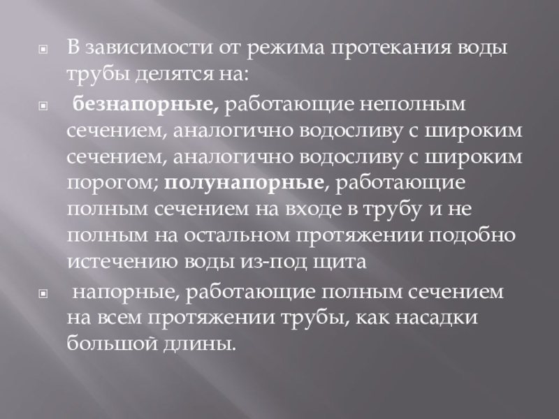 Слайд 3В зависимости от режима протекания воды трубы делятся на: