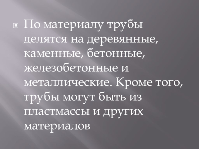 Слайд 13По материалу трубы делятся на деревянные, каменные, бетонные, железобетонные и металлические.