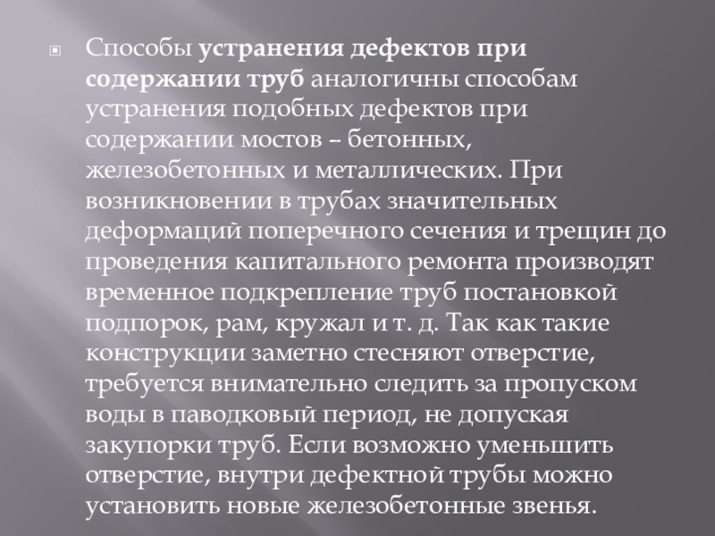 мостов – бетонных, железобетонных и металлических. При возникновении в трубах значительных деформаций поперечного сечения и трещин до проведения капитального ремонта производят временное подкрепление труб постановкой подпорок, рам, кружал и т. д. Так как такие конструкции заметно стесняют отверстие, требуется внимательно следить за пропуском воды в паводковый период, не допуская закупорки труб. Если возможно уменьшить отверстие, внутри дефектной трубы можно установить новые железобетонные звенья.