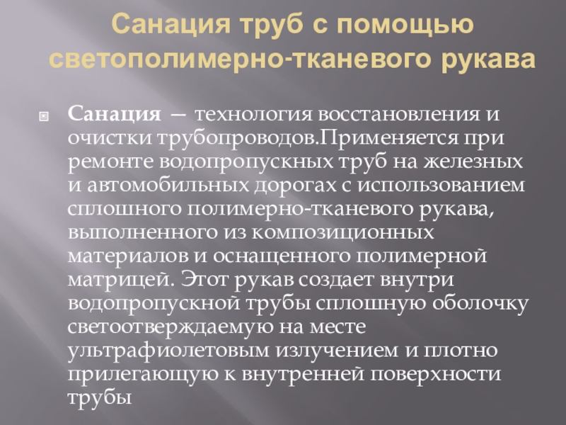 ремонте водопропускных труб на железных и автомобильных дорогах с использованием сплошного полимерно-тканевого рукава, выполненного из композиционных материалов и оснащенного полимерной матрицей. Этот рукав создает внутри водопропускной трубы сплошную оболочку светоотверждаемую на месте ультрафиолетовым излучением и плотно прилегающую к внутренней поверхности трубы