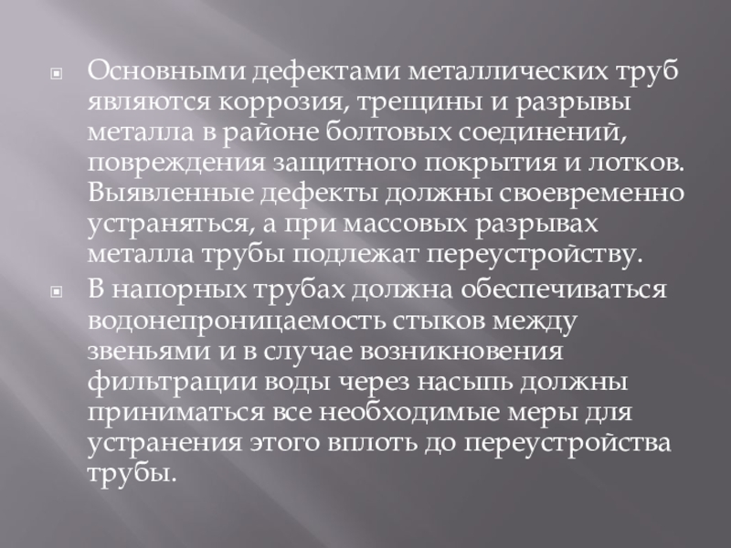 районе болтовых соединений, повреждения защитного покрытия и лотков. Выявленные дефекты должны своевременно устраняться, а при массовых разрывах металла трубы подлежат переустройству.