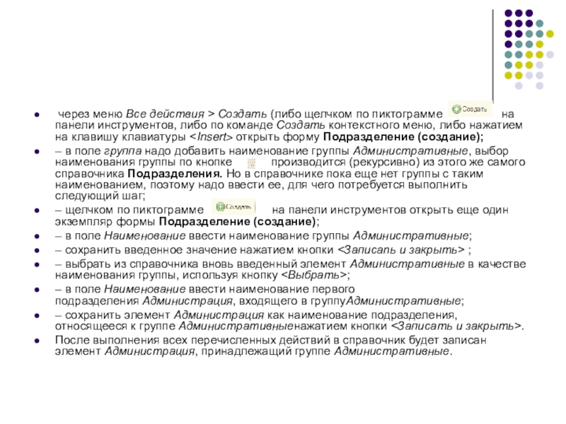 Слайд 4Создание новой группы подразделений Административные в справочнике Организации