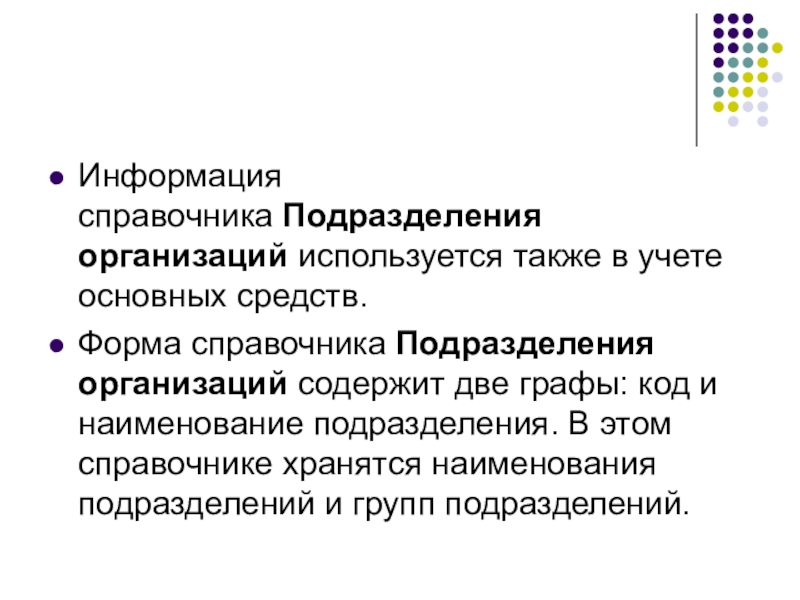 Информация справочника Подразделения организаций используется также в учете основных средств.Форма справочника Подразделения организаций содержит две графы: код и наименование подразделения. В